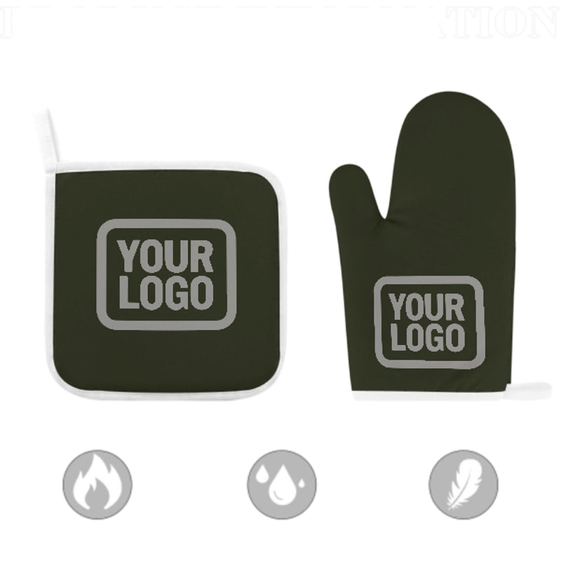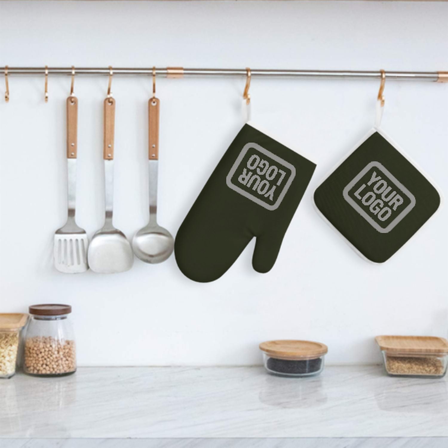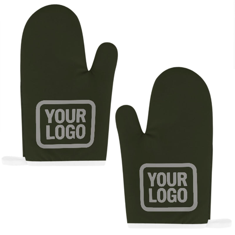 Стилен, термоустойчив комплект от 2 ръкавици за фурна, изработен от издръжлива полиестерна материя, идеален за безопасност и комфорт по време на готвене и печене.