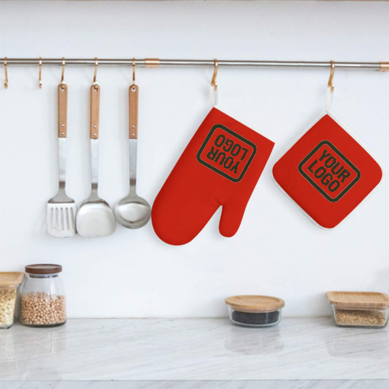 Стилен, термоустойчив комплект от 2 ръкавици за фурна, изработен от издръжлива полиестерна материя, идеален за безопасност и комфорт по време на готвене и печене.