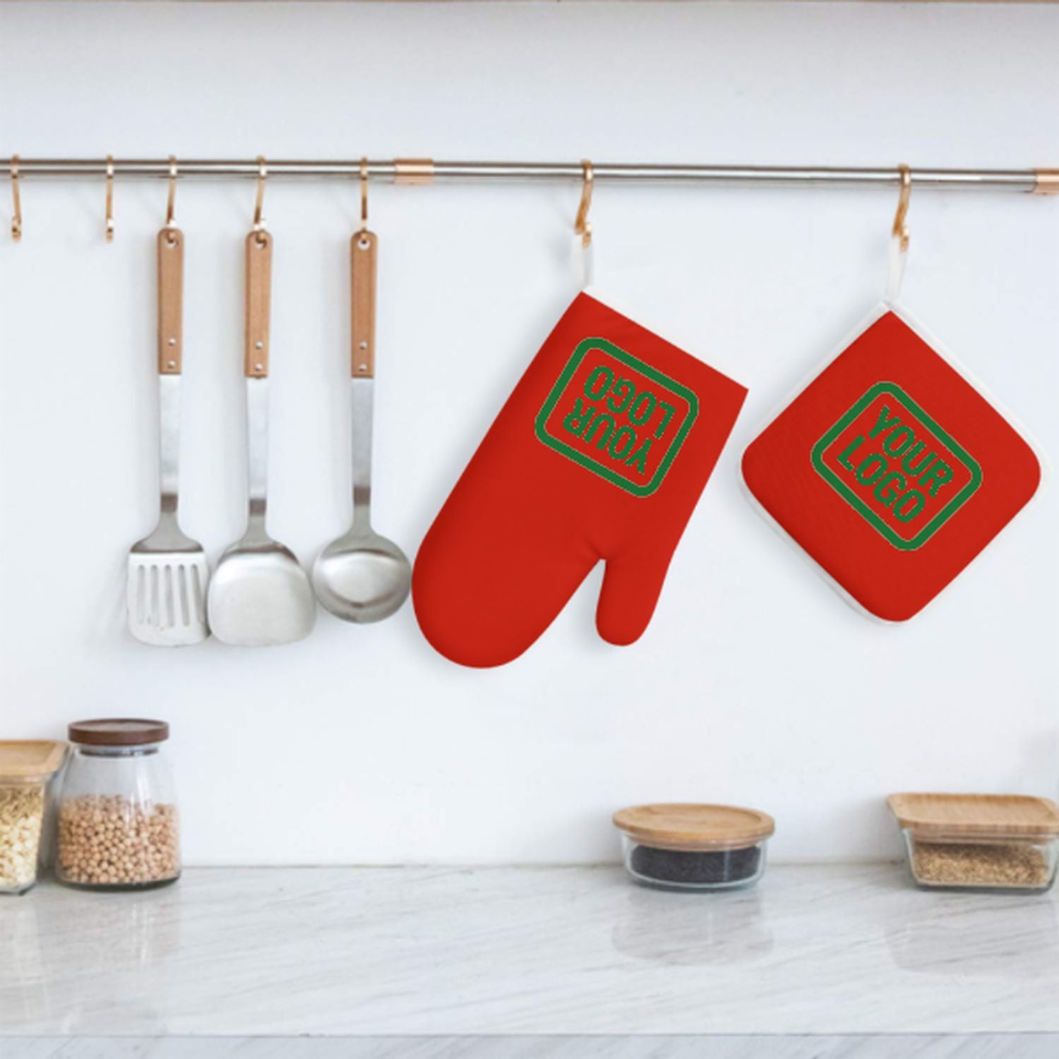 Стилен, термоустойчив комплект от 2 ръкавици за фурна, изработен от издръжлива полиестерна материя, идеален за безопасност и комфорт по време на готвене и печене.