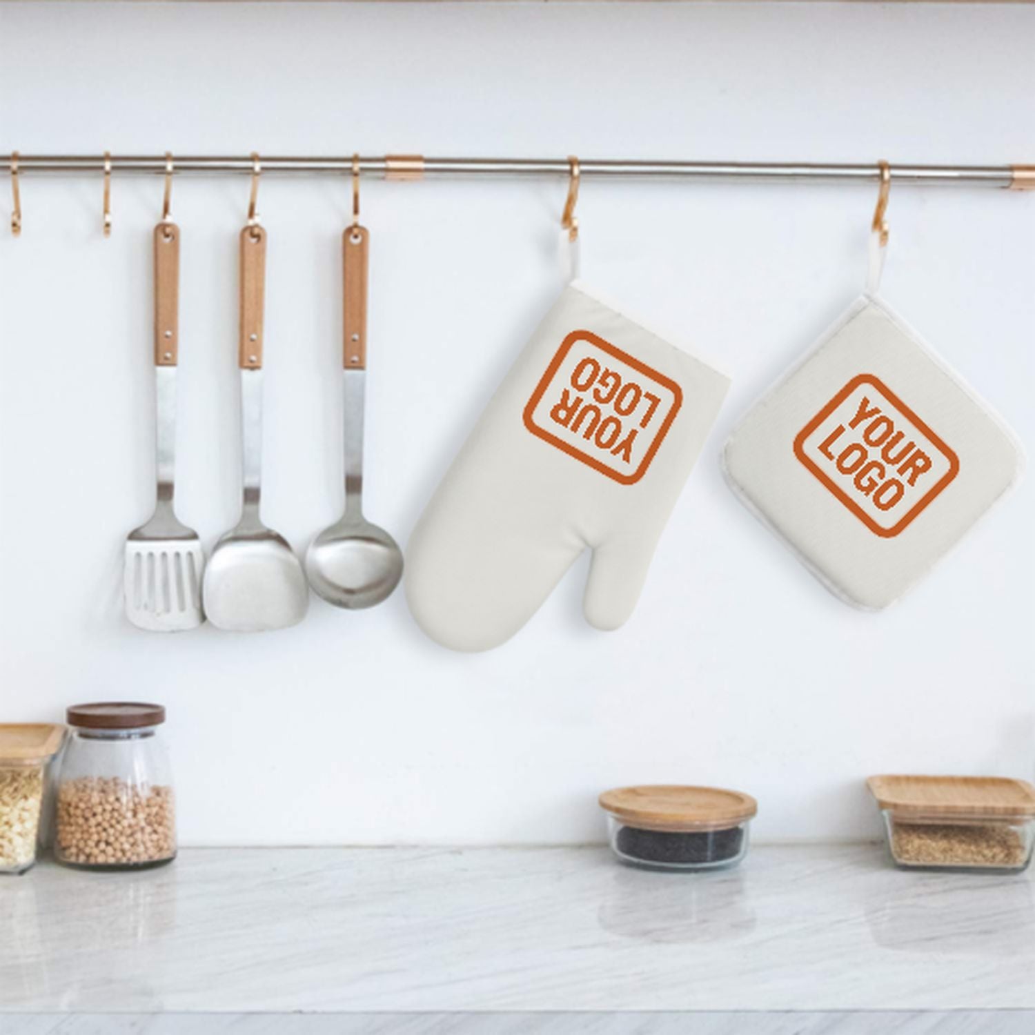 Стилен, термоустойчив комплект от 2 ръкавици за фурна, изработен от издръжлива полиестерна материя, идеален за безопасност и комфорт по време на готвене и печене.