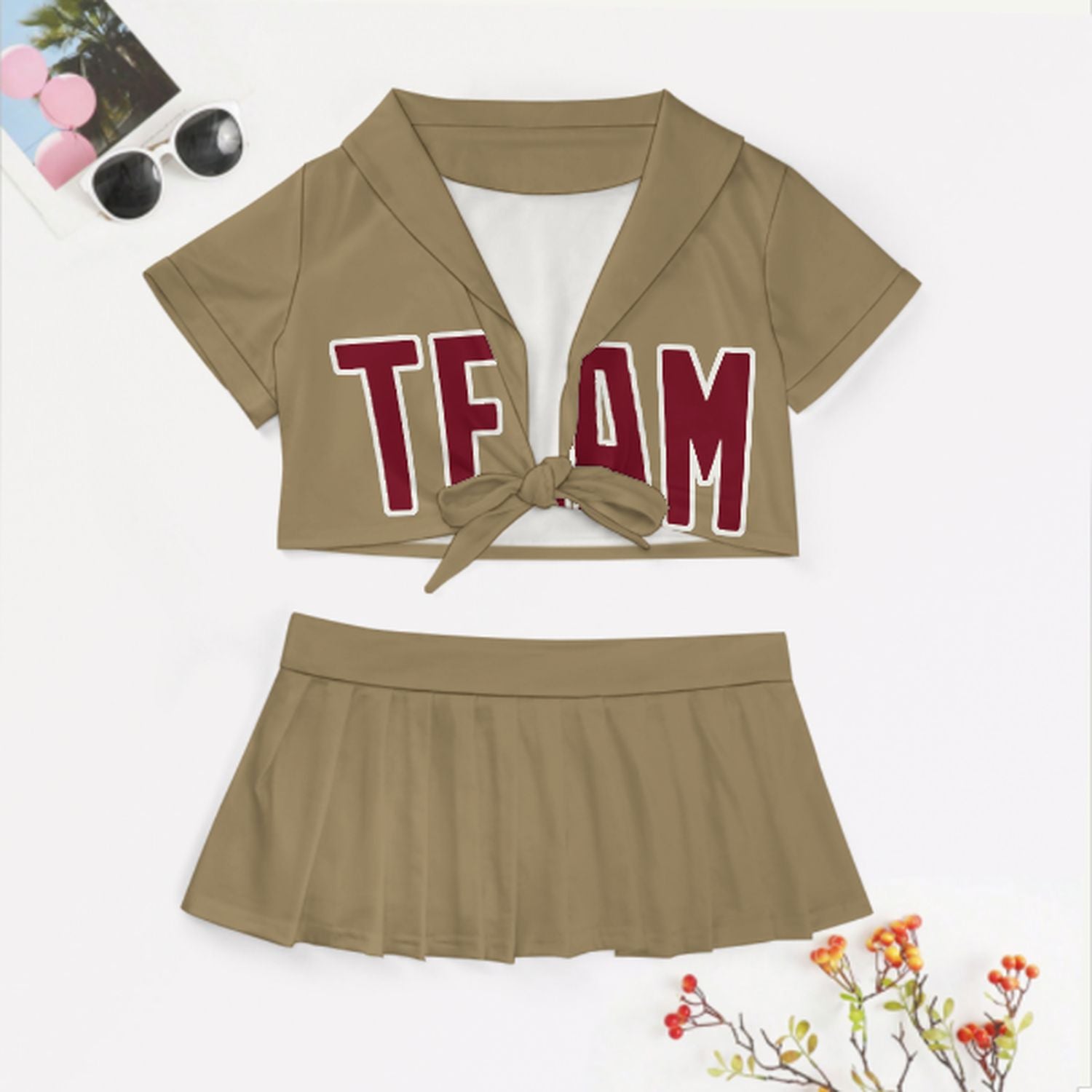 Maßgeschneidertes Hellkhaki Karmesinrot Cheerleader Outfit Set