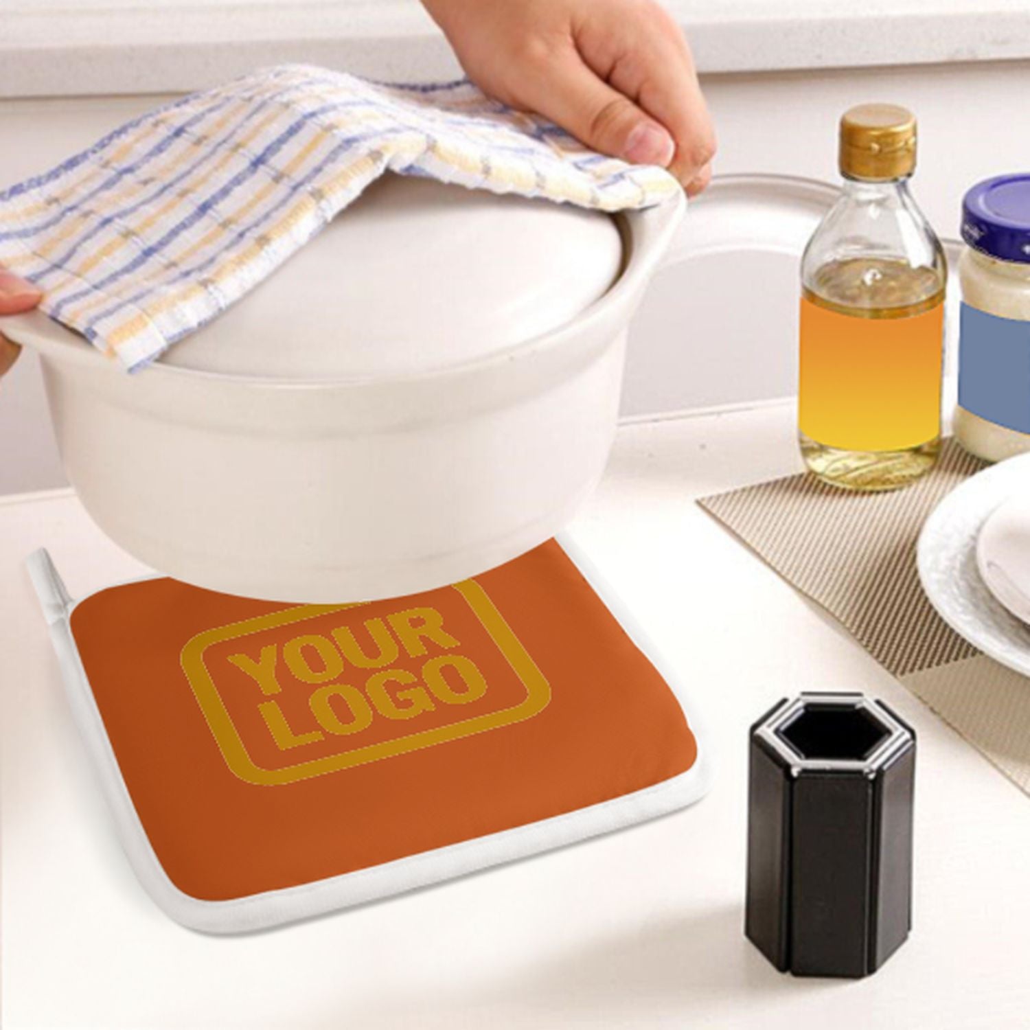 Ein stilvolles, hitzebeständiges 2-teiliges Topfhandschuh-Set aus robustem Polyestergewebe, ideal für Sicherheit und Komfort beim Kochen und Backen.
