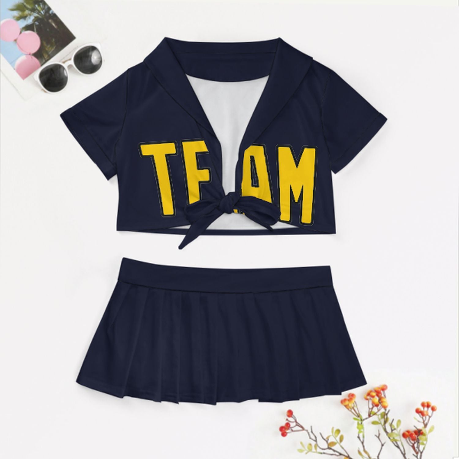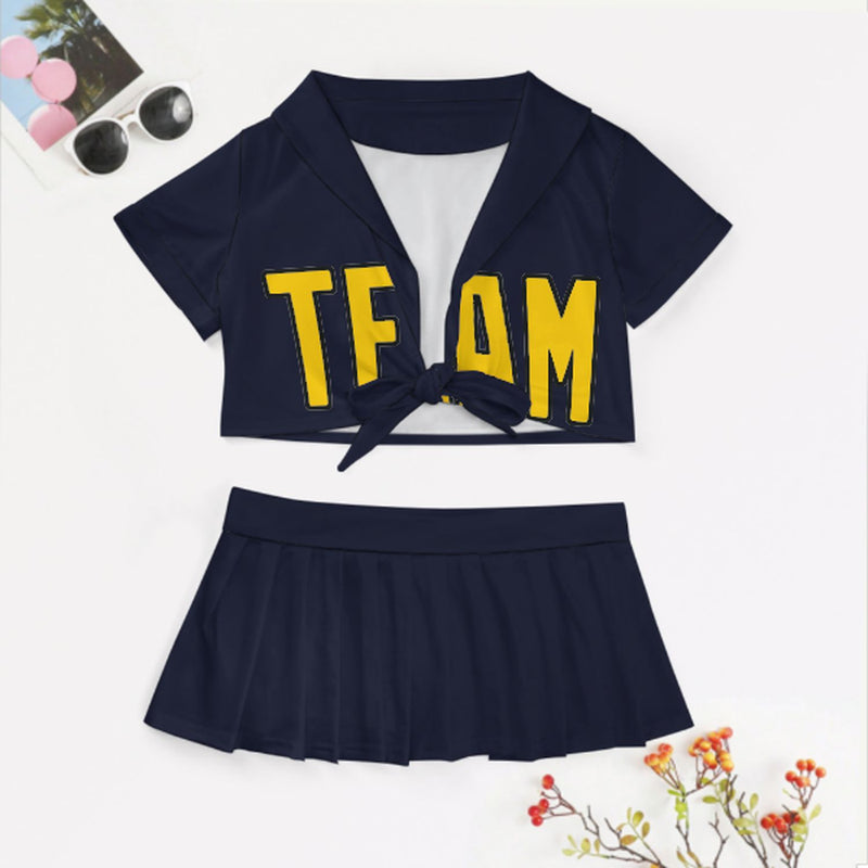 Maßgeschneidertes Stahlblau Gold Cheerleader Outfit Set