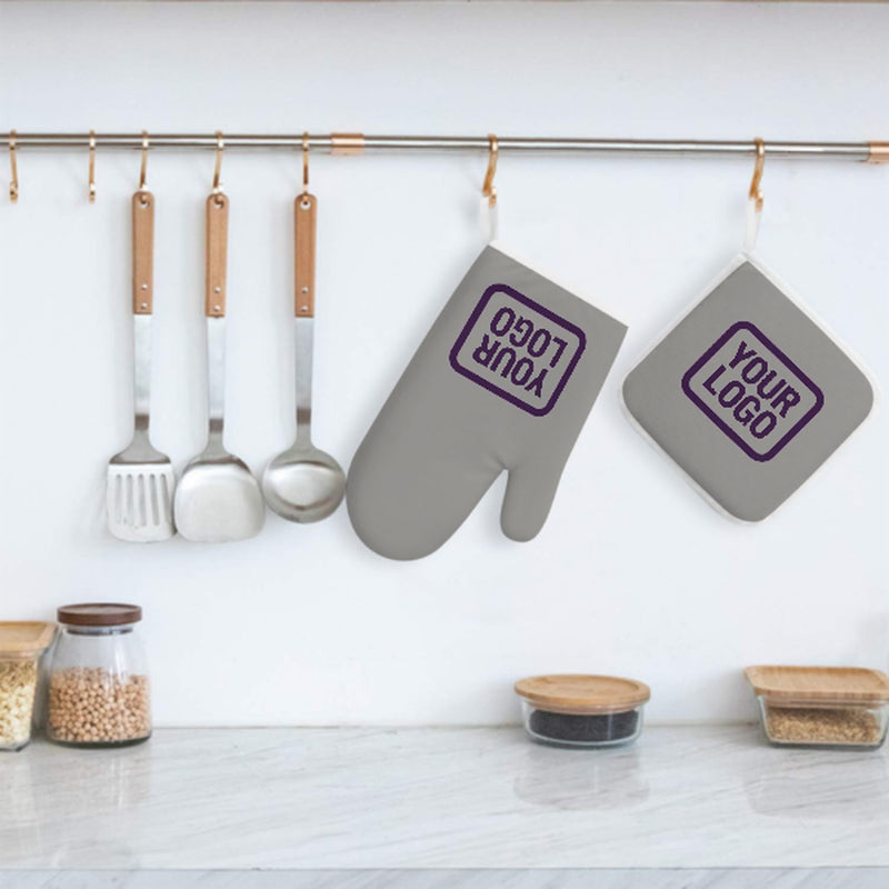Ein stilvolles, hitzebeständiges 2-teiliges Topfhandschuh-Set aus robustem Polyestergewebe, ideal für Sicherheit und Komfort beim Kochen und Backen.