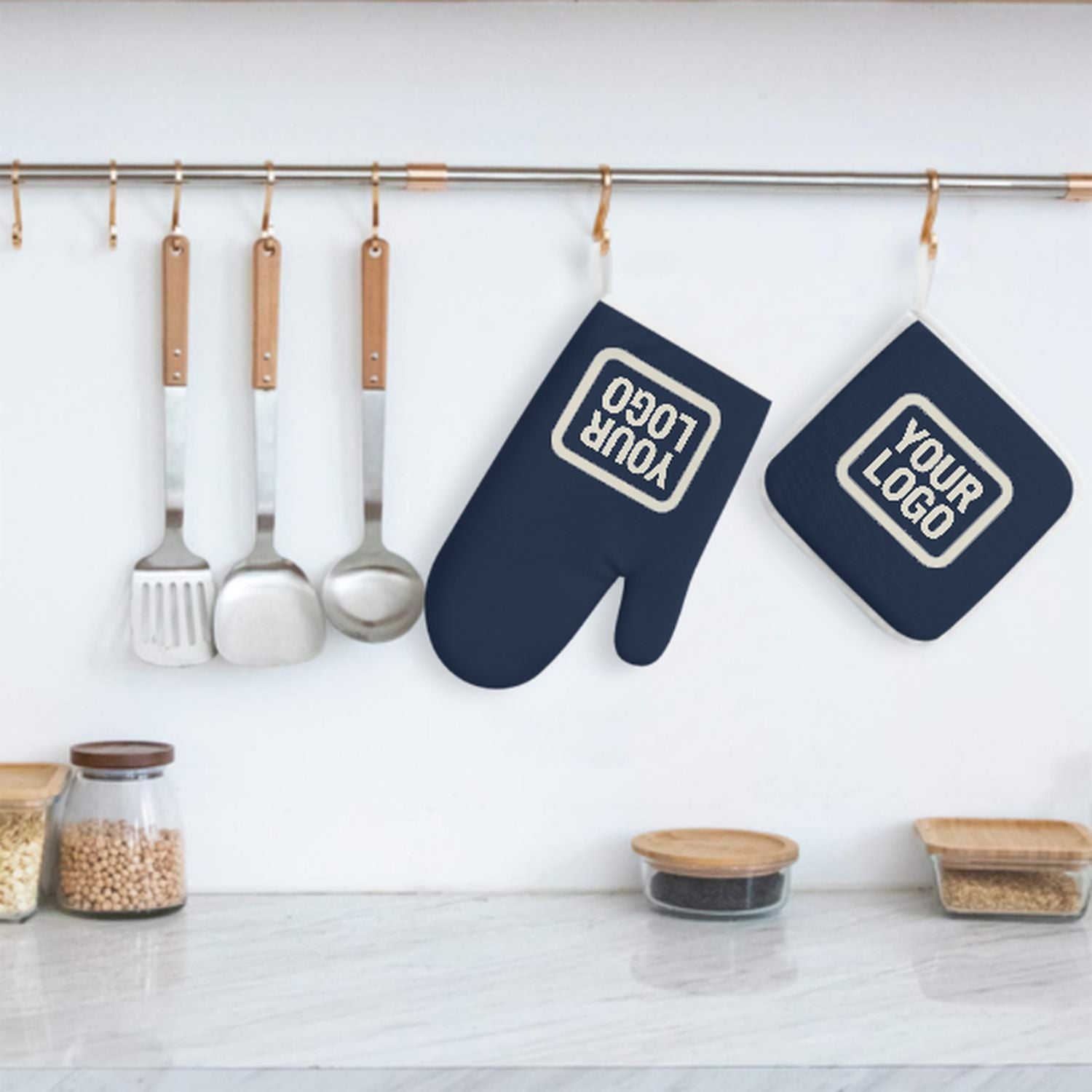 Maßgeschneidertes Marineblau Beige Topfhandschuh Set – 2-teilig