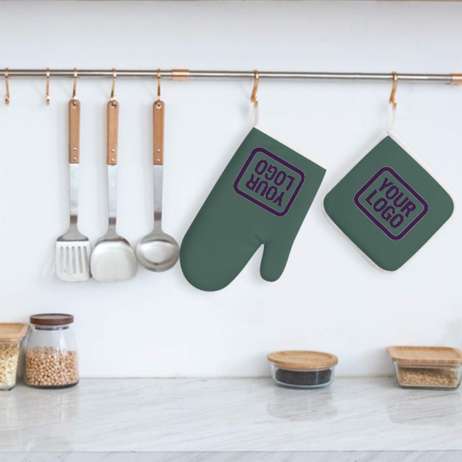 Ein stilvolles, hitzebeständiges 2-teiliges Topfhandschuh-Set aus robustem Polyestergewebe, ideal für Sicherheit und Komfort beim Kochen und Backen.