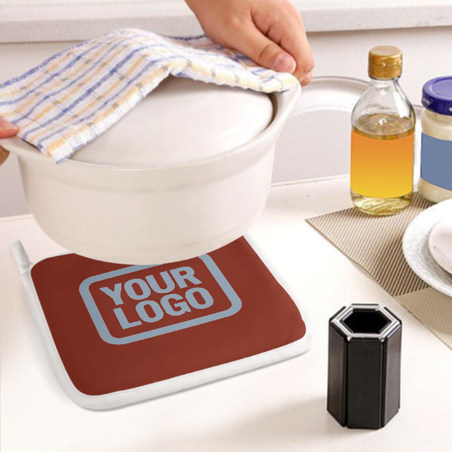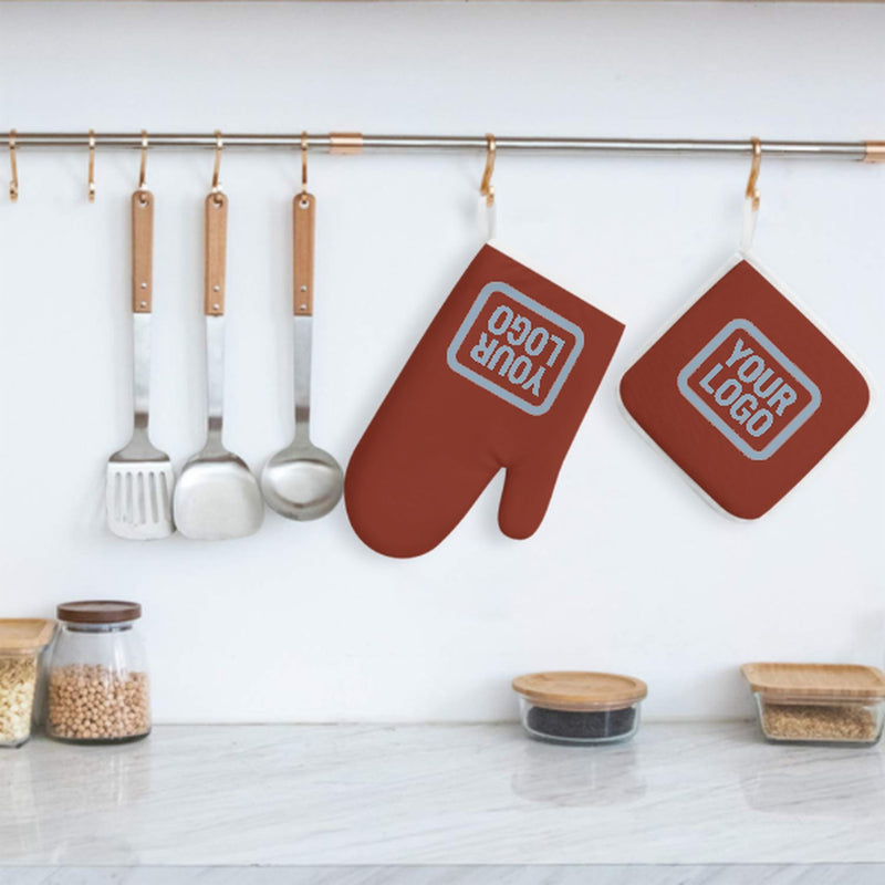 Ein stilvolles, hitzebeständiges 2-teiliges Topfhandschuh-Set aus robustem Polyestergewebe, ideal für Sicherheit und Komfort beim Kochen und Backen.
