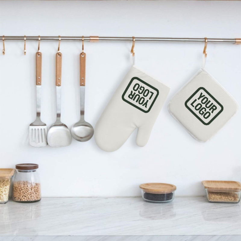 Ein stilvolles, hitzebeständiges 2-teiliges Topfhandschuh-Set aus robustem Polyestergewebe, ideal für Sicherheit und Komfort beim Kochen und Backen.