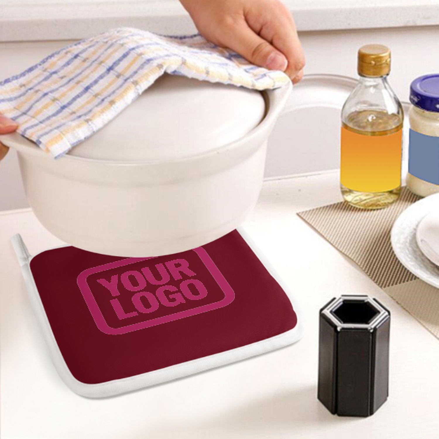 Ein stilvolles, hitzebeständiges 2-teiliges Topfhandschuh-Set aus robustem Polyestergewebe, ideal für Sicherheit und Komfort beim Kochen und Backen.