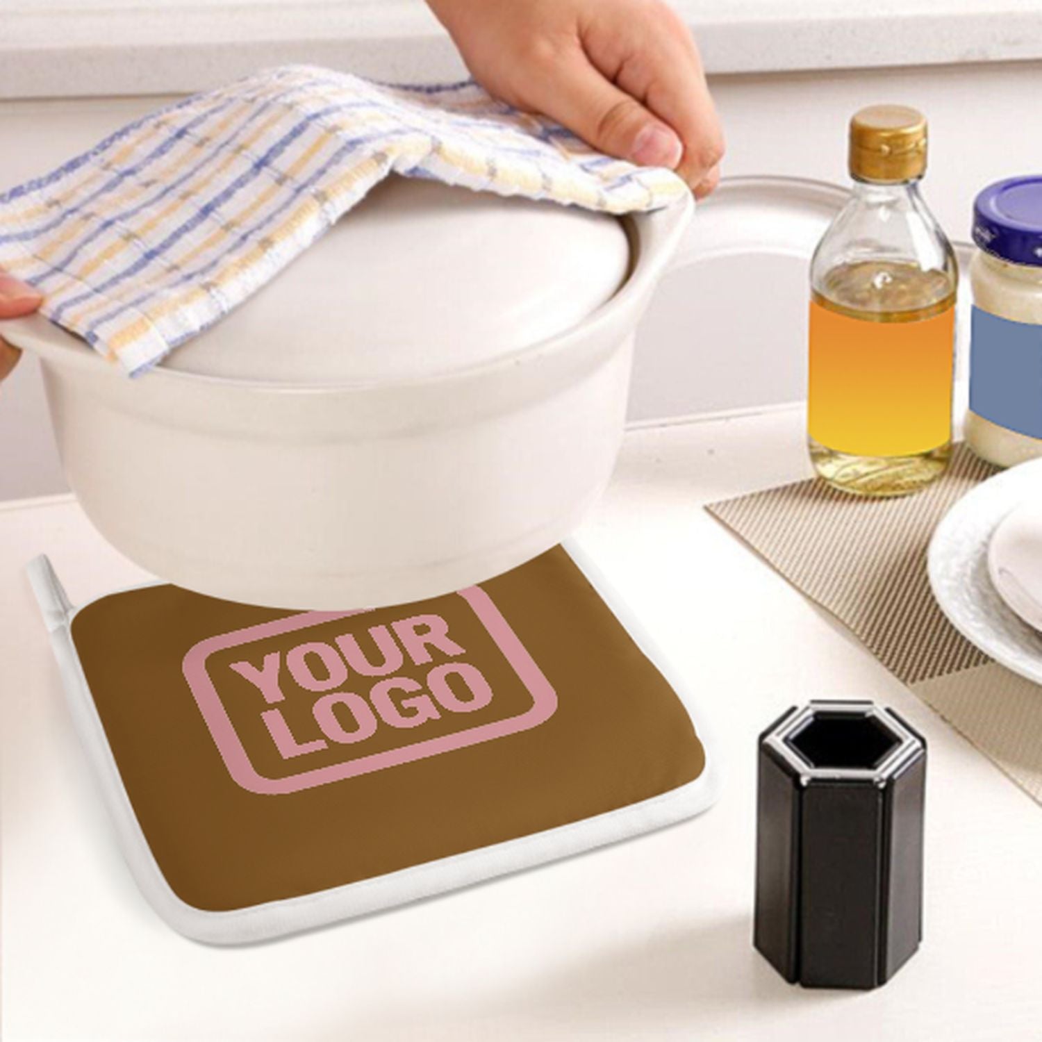 Ein stilvolles, hitzebeständiges 2-teiliges Topfhandschuh-Set aus robustem Polyestergewebe, ideal für Sicherheit und Komfort beim Kochen und Backen.