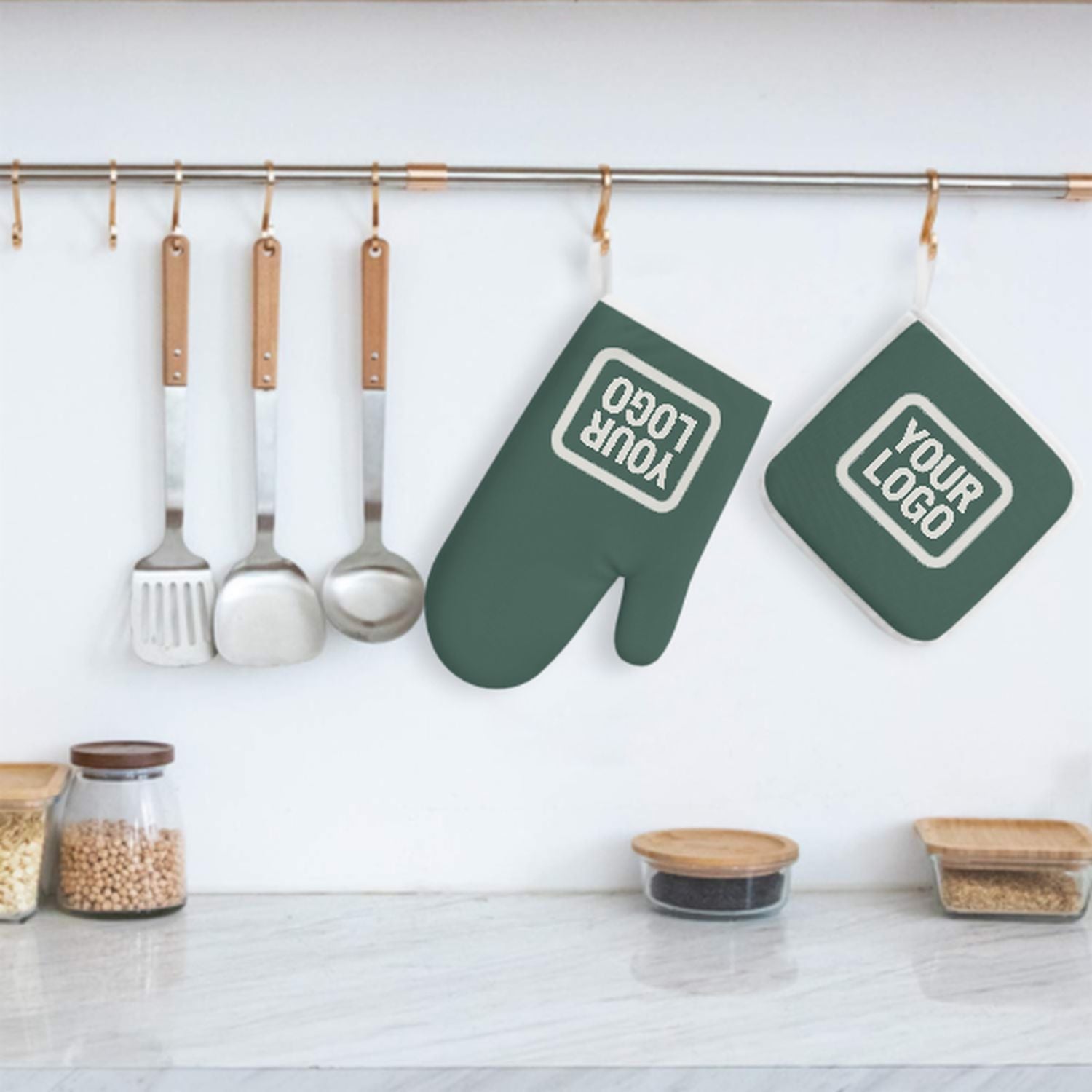 Ein stilvolles, hitzebeständiges 2-teiliges Topfhandschuh-Set aus robustem Polyestergewebe, ideal für Sicherheit und Komfort beim Kochen und Backen.