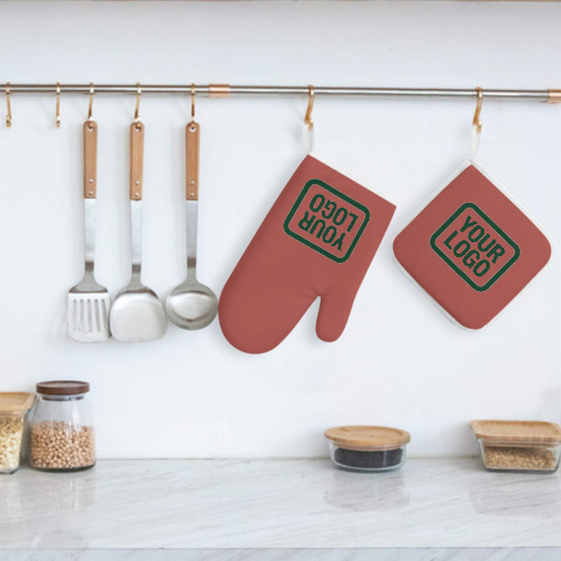 Ein stilvolles, hitzebeständiges 2-teiliges Topfhandschuh-Set aus robustem Polyestergewebe, ideal für Sicherheit und Komfort beim Kochen und Backen.