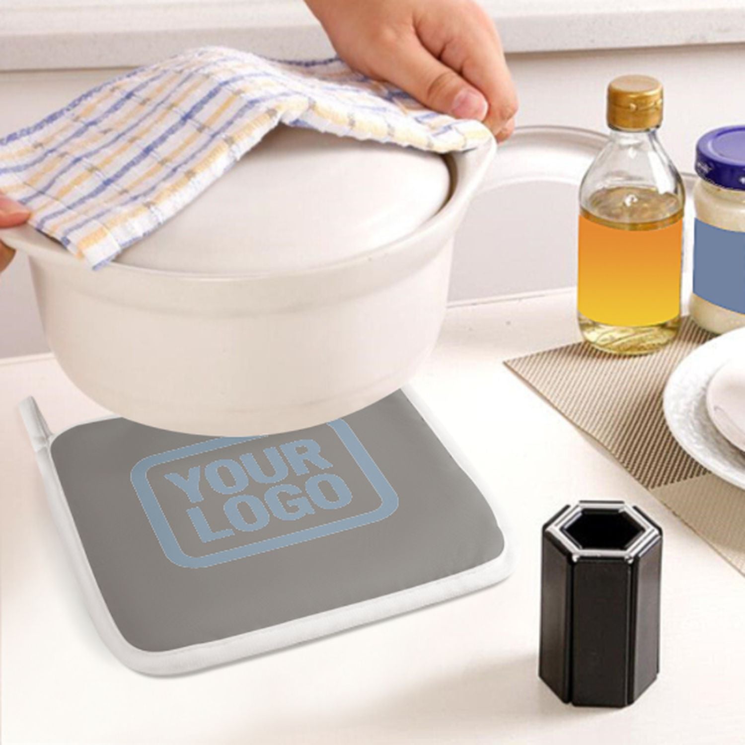 Ein stilvolles, hitzebeständiges 2-teiliges Topfhandschuh-Set aus robustem Polyestergewebe, ideal für Sicherheit und Komfort beim Kochen und Backen.