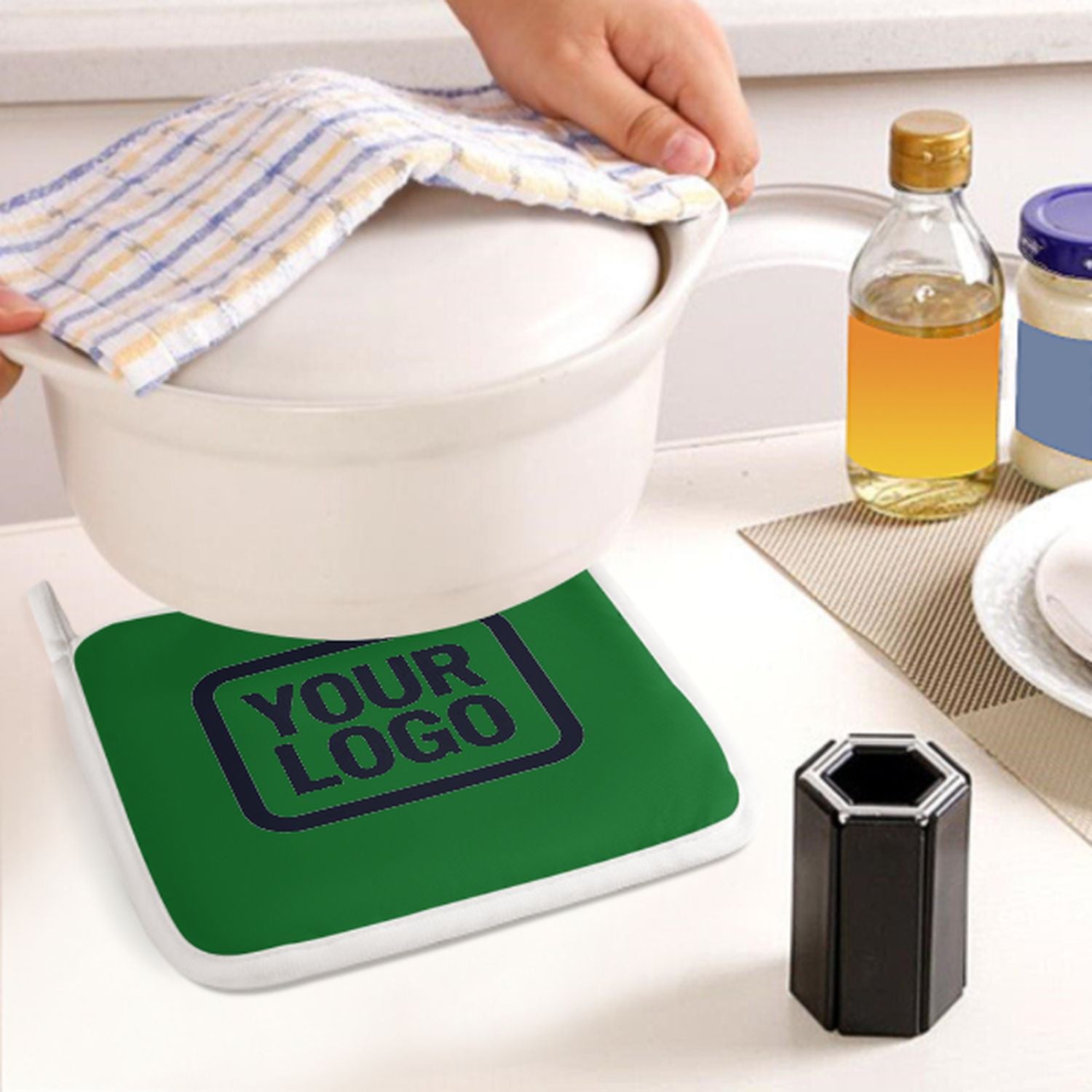 Ein stilvolles, hitzebeständiges 2-teiliges Topfhandschuh-Set aus robustem Polyestergewebe, ideal für Sicherheit und Komfort beim Kochen und Backen.