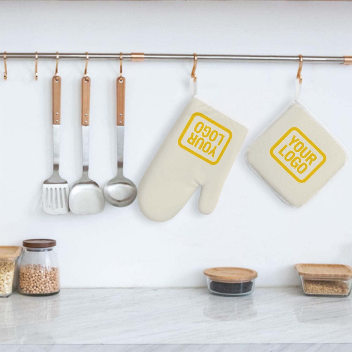 Maßgeschneidertes Beige Gold Topfhandschuh Set – 2-teilig