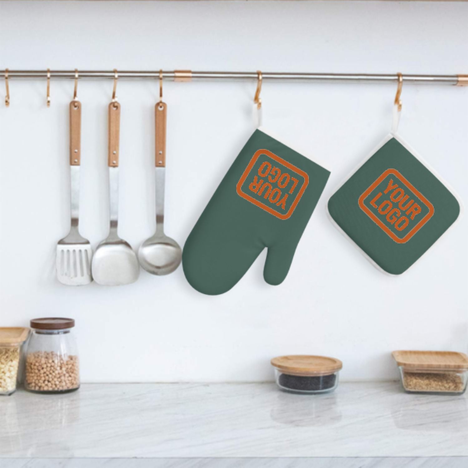 Maßgeschneidertes Blaugrün Orange Topfhandschuh Set – 2-teilig