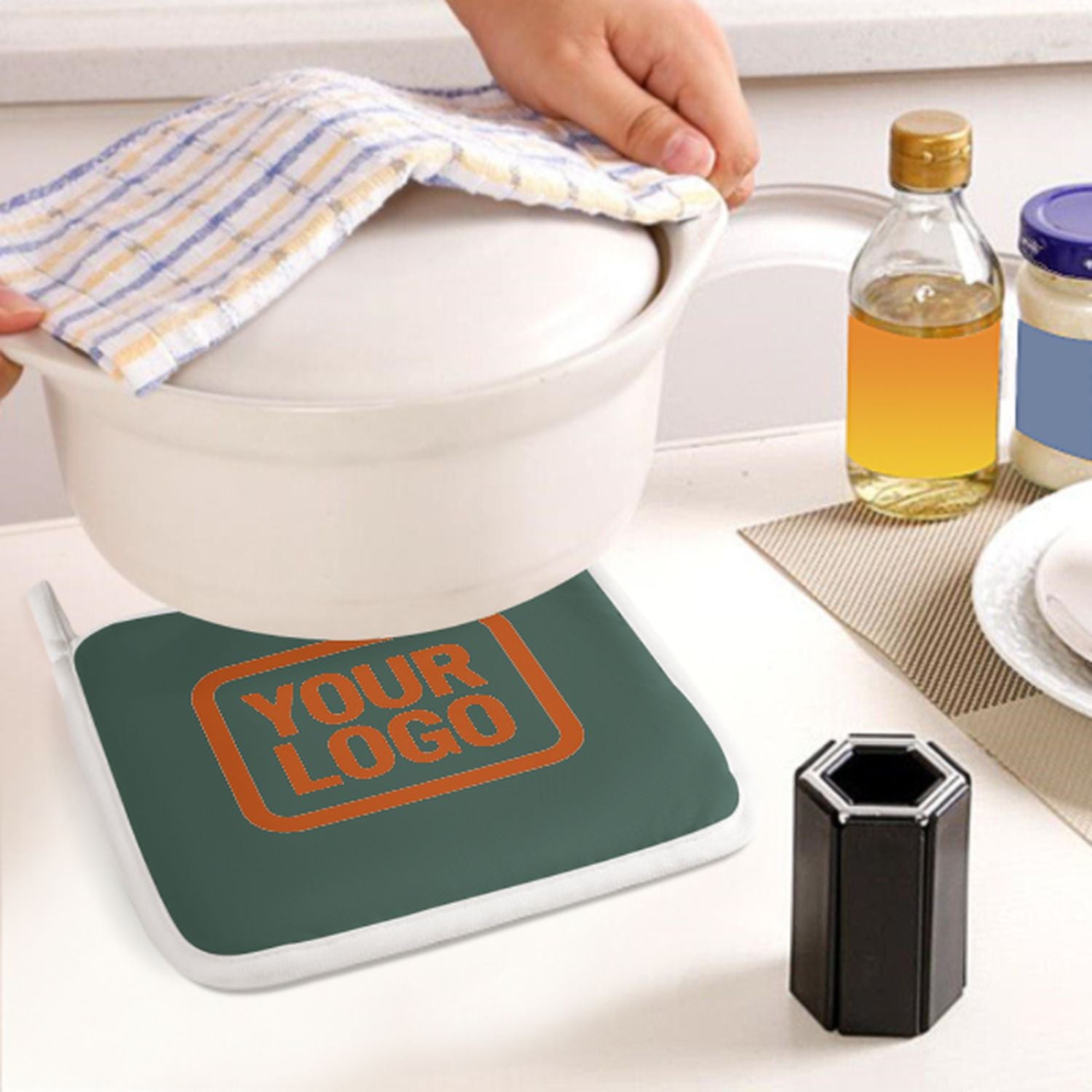Ein stilvolles, hitzebeständiges 2-teiliges Topfhandschuh-Set aus robustem Polyestergewebe, ideal für Sicherheit und Komfort beim Kochen und Backen.