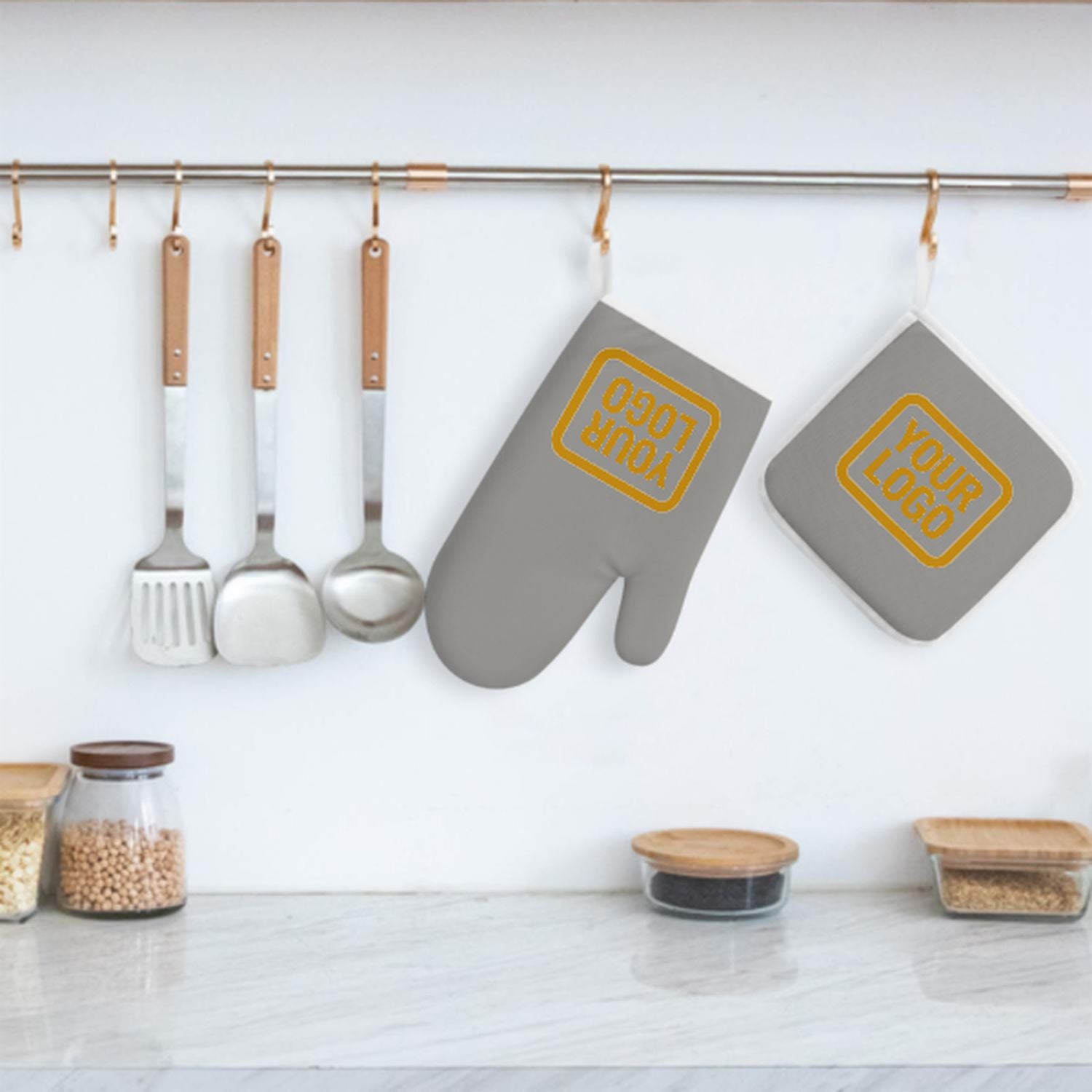 Ein stilvolles, hitzebeständiges 2-teiliges Topfhandschuh-Set aus robustem Polyestergewebe, ideal für Sicherheit und Komfort beim Kochen und Backen.