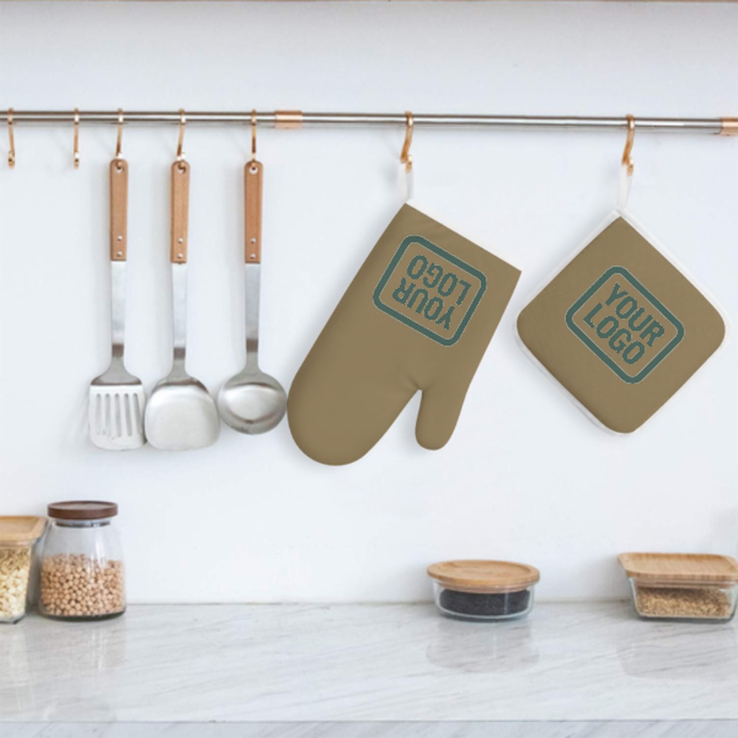 Ein stilvolles, hitzebeständiges 2-teiliges Topfhandschuh-Set aus robustem Polyestergewebe, ideal für Sicherheit und Komfort beim Kochen und Backen.