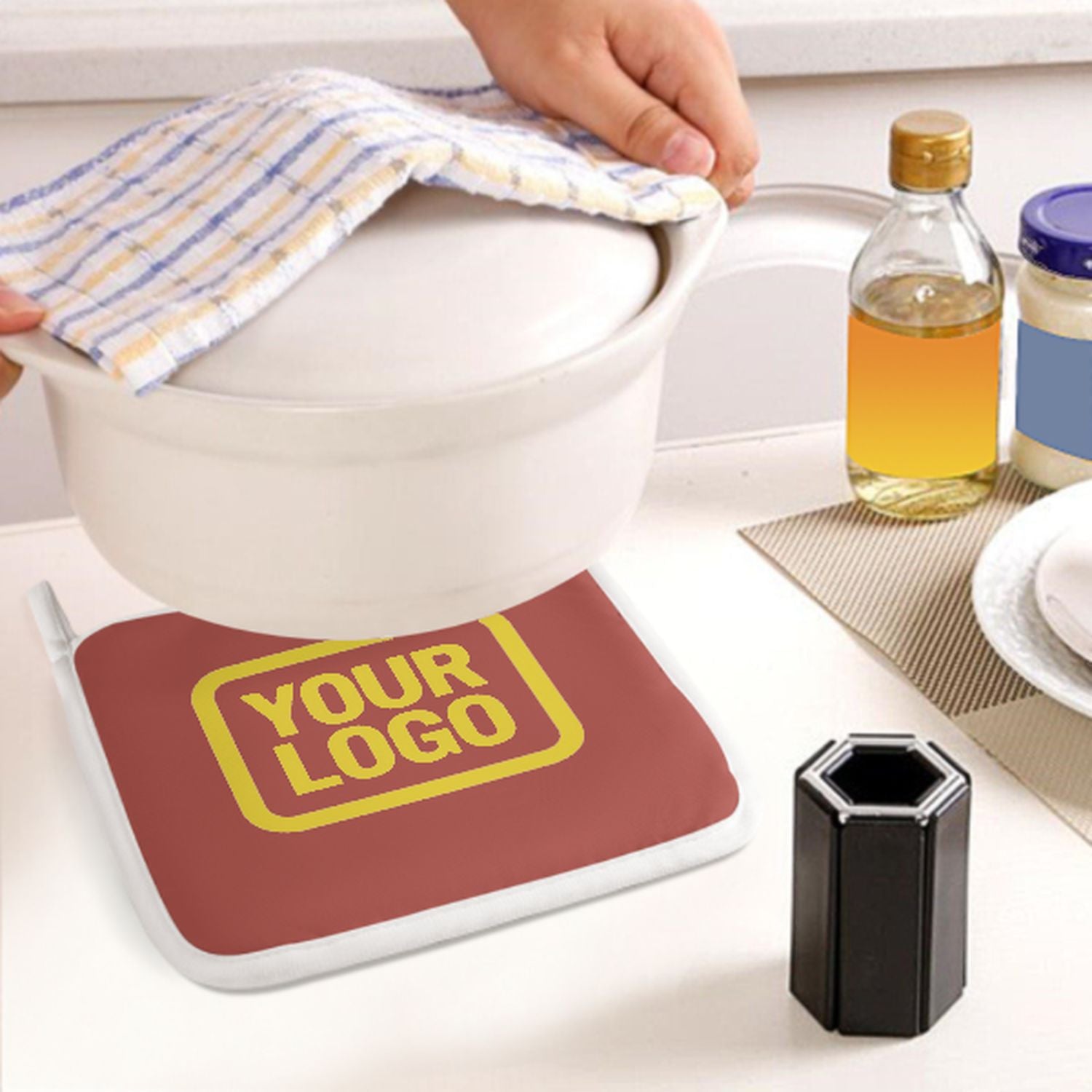 Ein stilvolles, hitzebeständiges 2-teiliges Topfhandschuh-Set aus robustem Polyestergewebe, ideal für Sicherheit und Komfort beim Kochen und Backen.