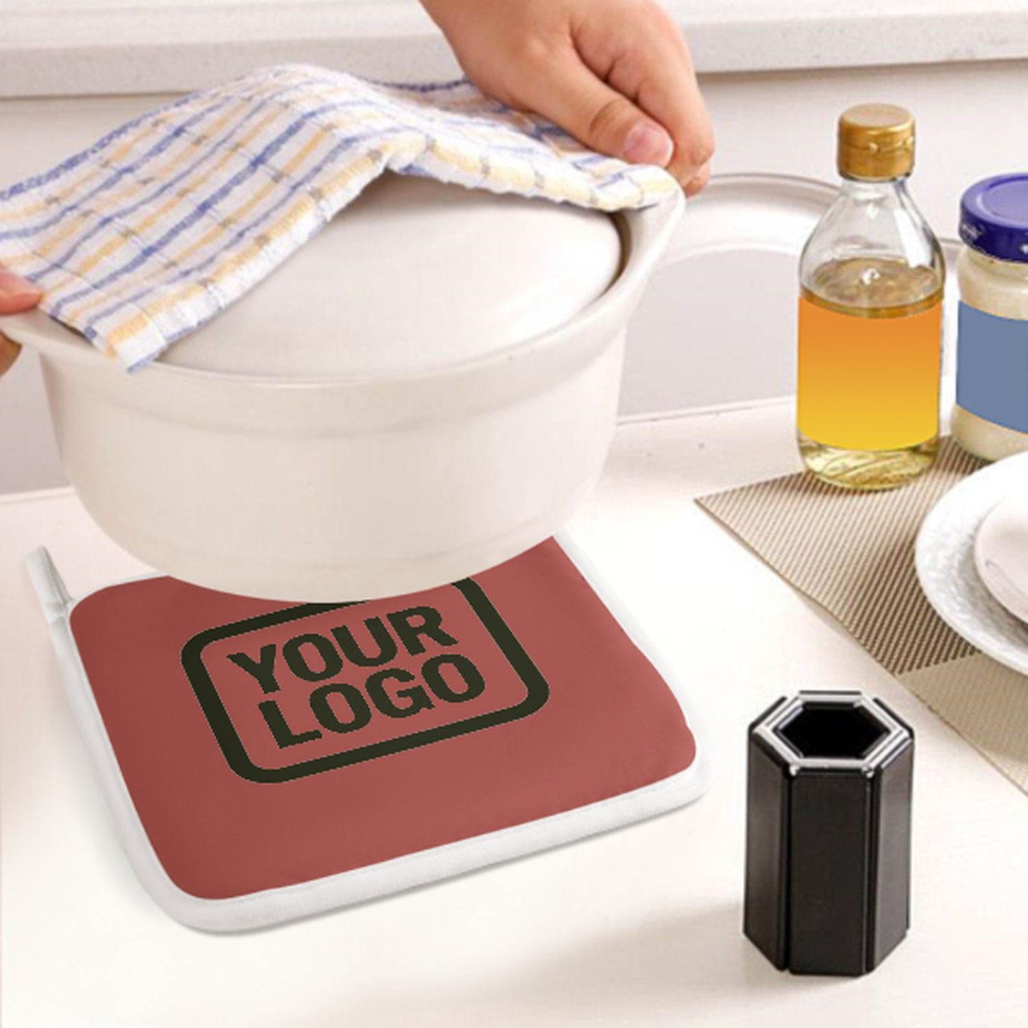 Ein stilvolles, hitzebeständiges 2-teiliges Topfhandschuh-Set aus robustem Polyestergewebe, ideal für Sicherheit und Komfort beim Kochen und Backen.