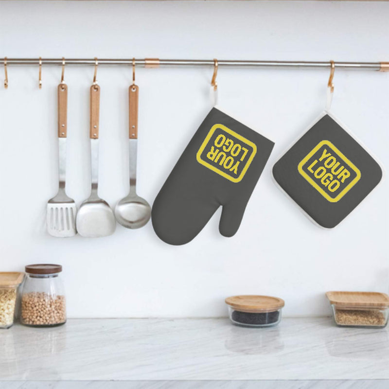 Ett snyggt, värmebeständigt set med ugnsvantar i två delar tillverkat av slitstarkt polyestertyg, perfekt för säkerhet och komfort vid matlagning och bakning.