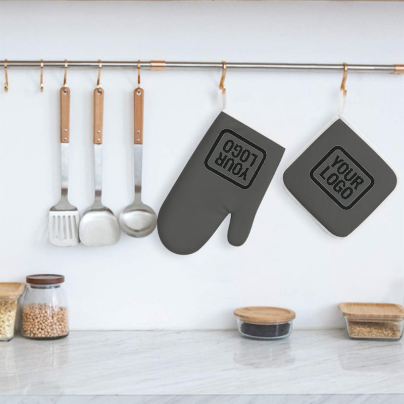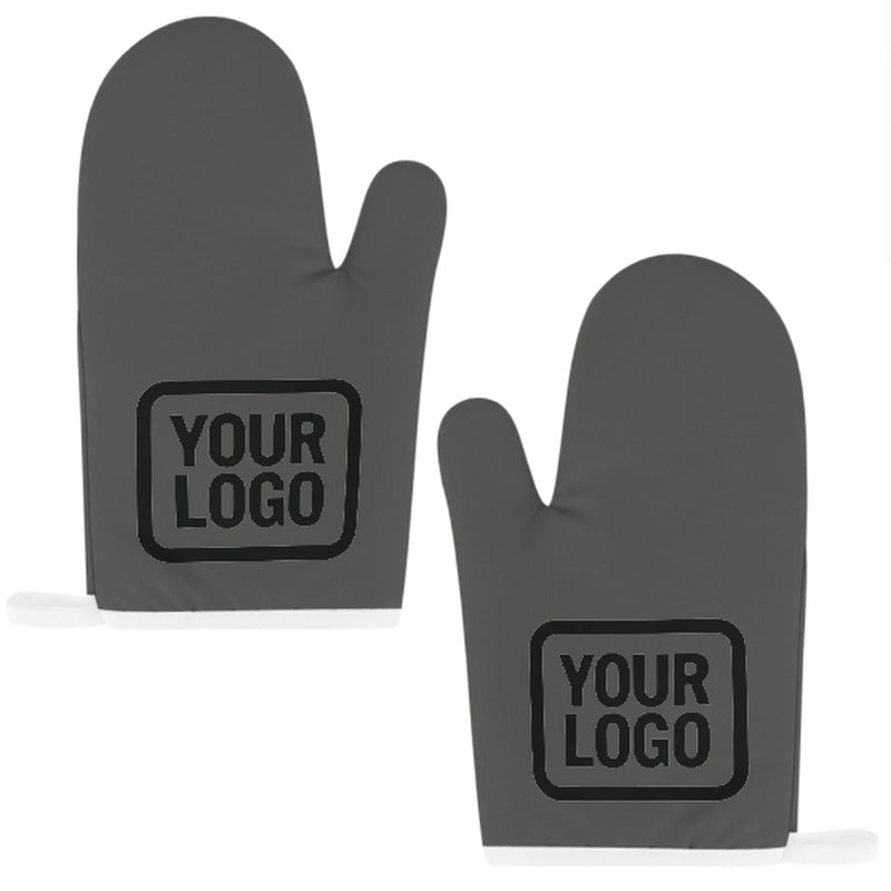 Ett snyggt, värmebeständigt set med ugnsvantar i två delar tillverkat av slitstarkt polyestertyg, perfekt för säkerhet och komfort vid matlagning och bakning.