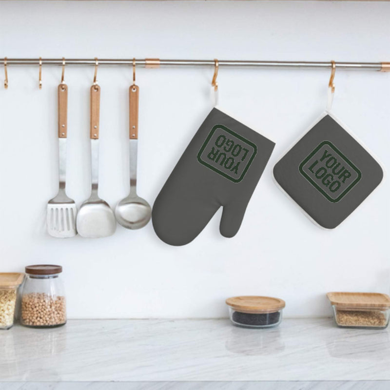 Ett snyggt, värmebeständigt set med ugnsvantar i två delar tillverkat av slitstarkt polyestertyg, perfekt för säkerhet och komfort vid matlagning och bakning.