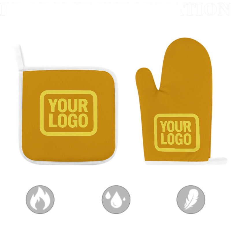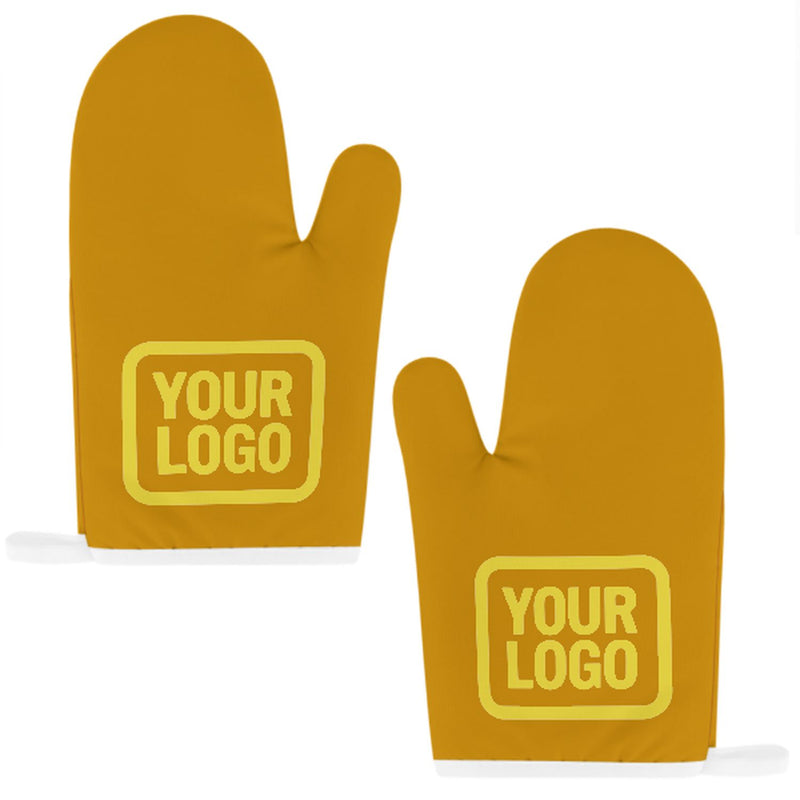 Ett snyggt, värmebeständigt set med ugnsvantar i två delar tillverkat av slitstarkt polyestertyg, perfekt för säkerhet och komfort vid matlagning och bakning.