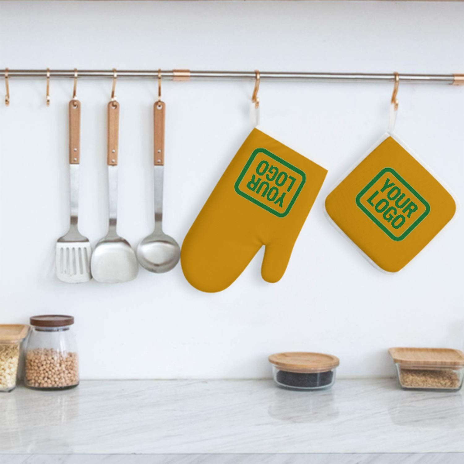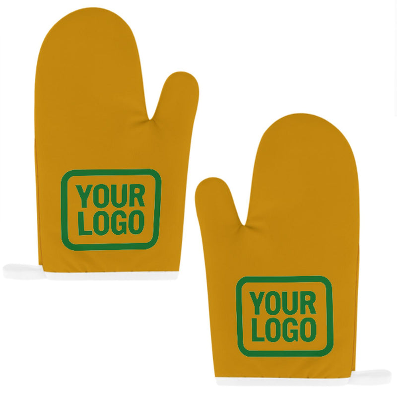 Ett snyggt, värmebeständigt set med ugnsvantar i två delar tillverkat av slitstarkt polyestertyg, perfekt för säkerhet och komfort vid matlagning och bakning.