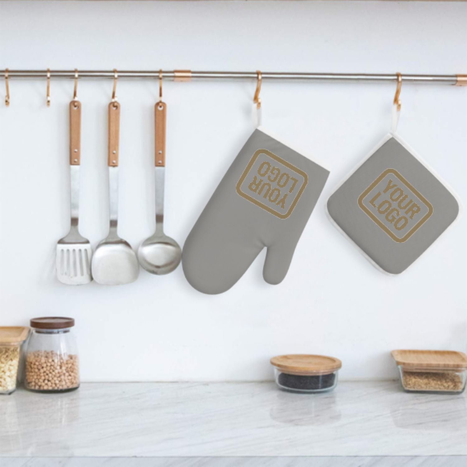 Ett snyggt, värmebeständigt set med ugnsvantar i två delar tillverkat av slitstarkt polyestertyg, perfekt för säkerhet och komfort vid matlagning och bakning.