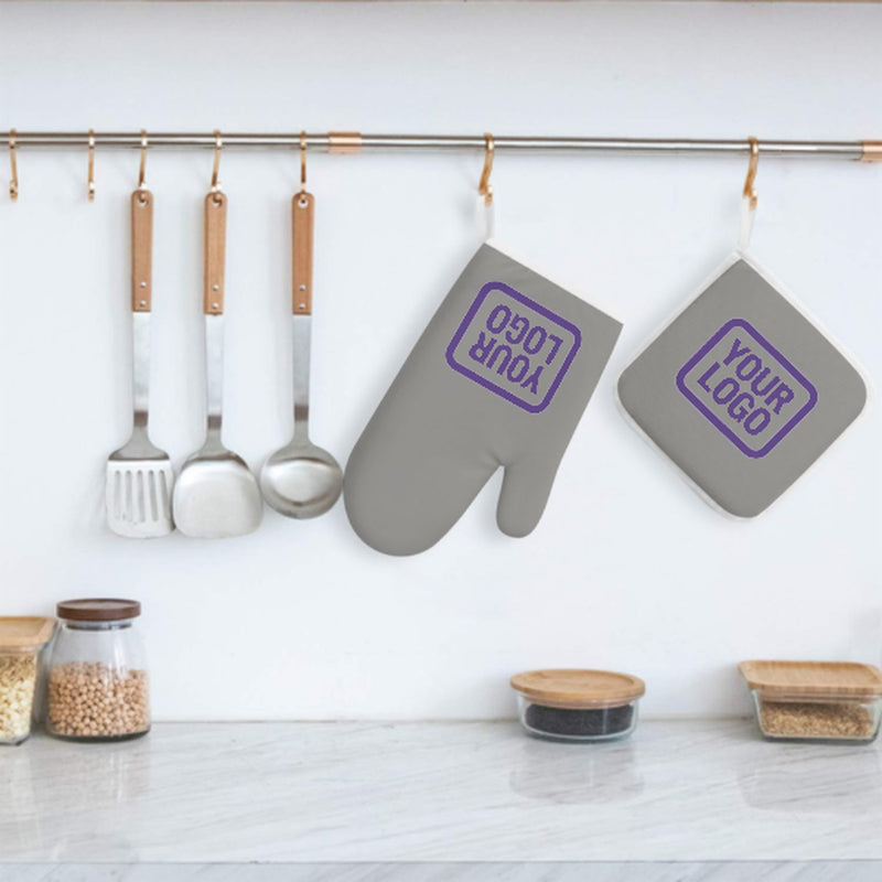 Ett snyggt, värmebeständigt set med ugnsvantar i två delar tillverkat av slitstarkt polyestertyg, perfekt för säkerhet och komfort vid matlagning och bakning.