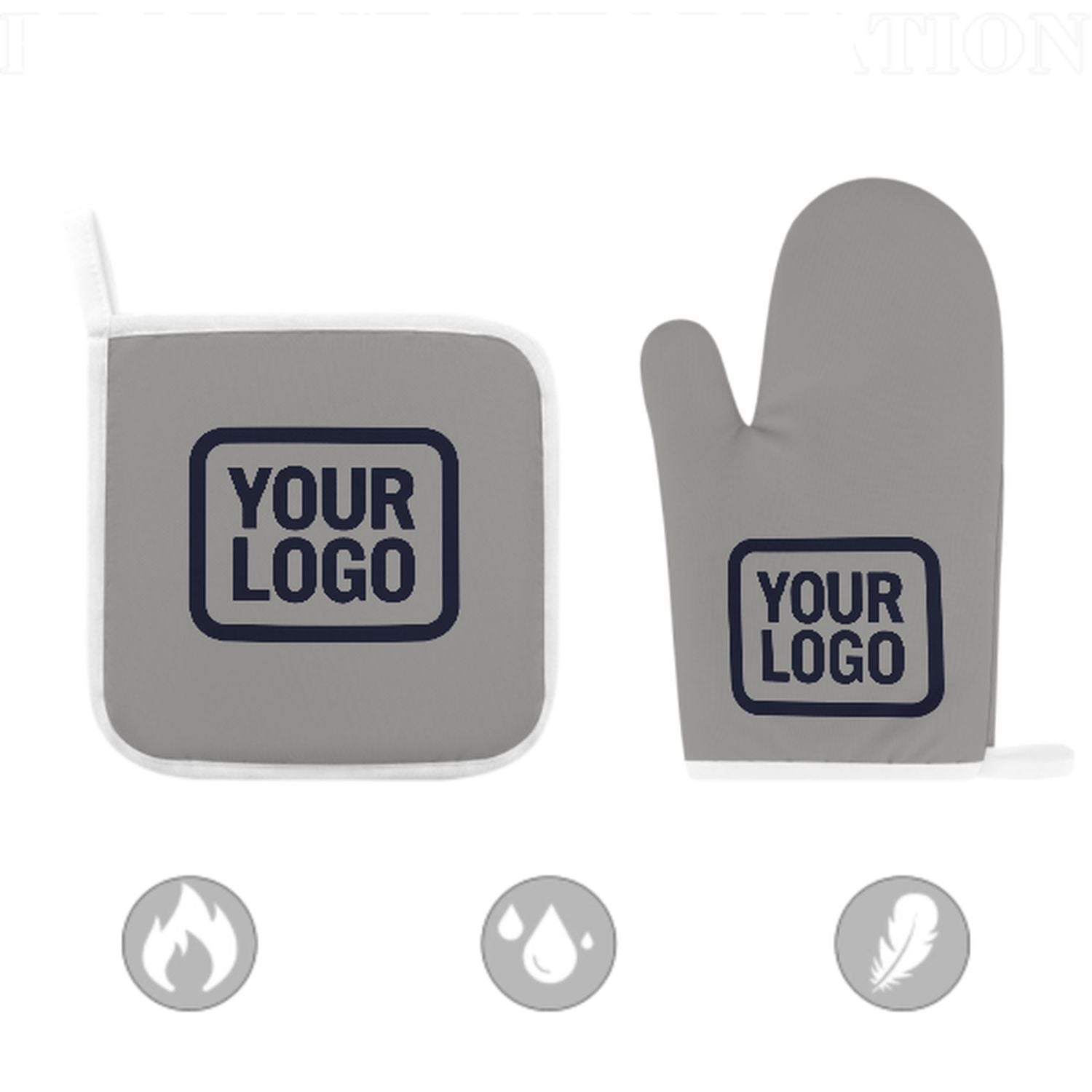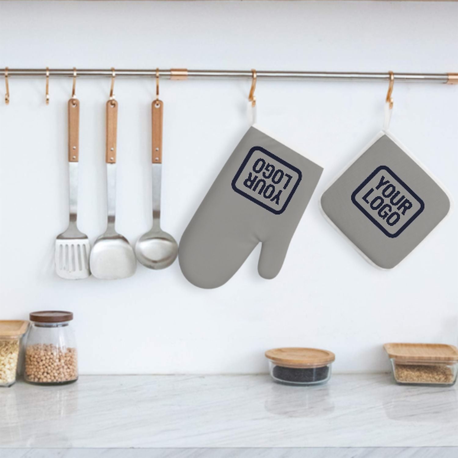 Ett snyggt, värmebeständigt set med ugnsvantar i två delar tillverkat av slitstarkt polyestertyg, perfekt för säkerhet och komfort vid matlagning och bakning.