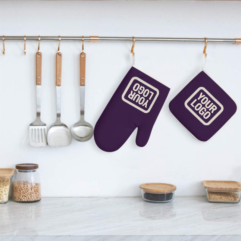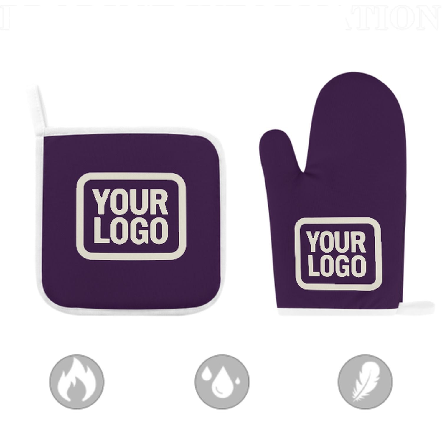 Ett snyggt, värmebeständigt set med ugnsvantar i två delar tillverkat av slitstarkt polyestertyg, perfekt för säkerhet och komfort vid matlagning och bakning.