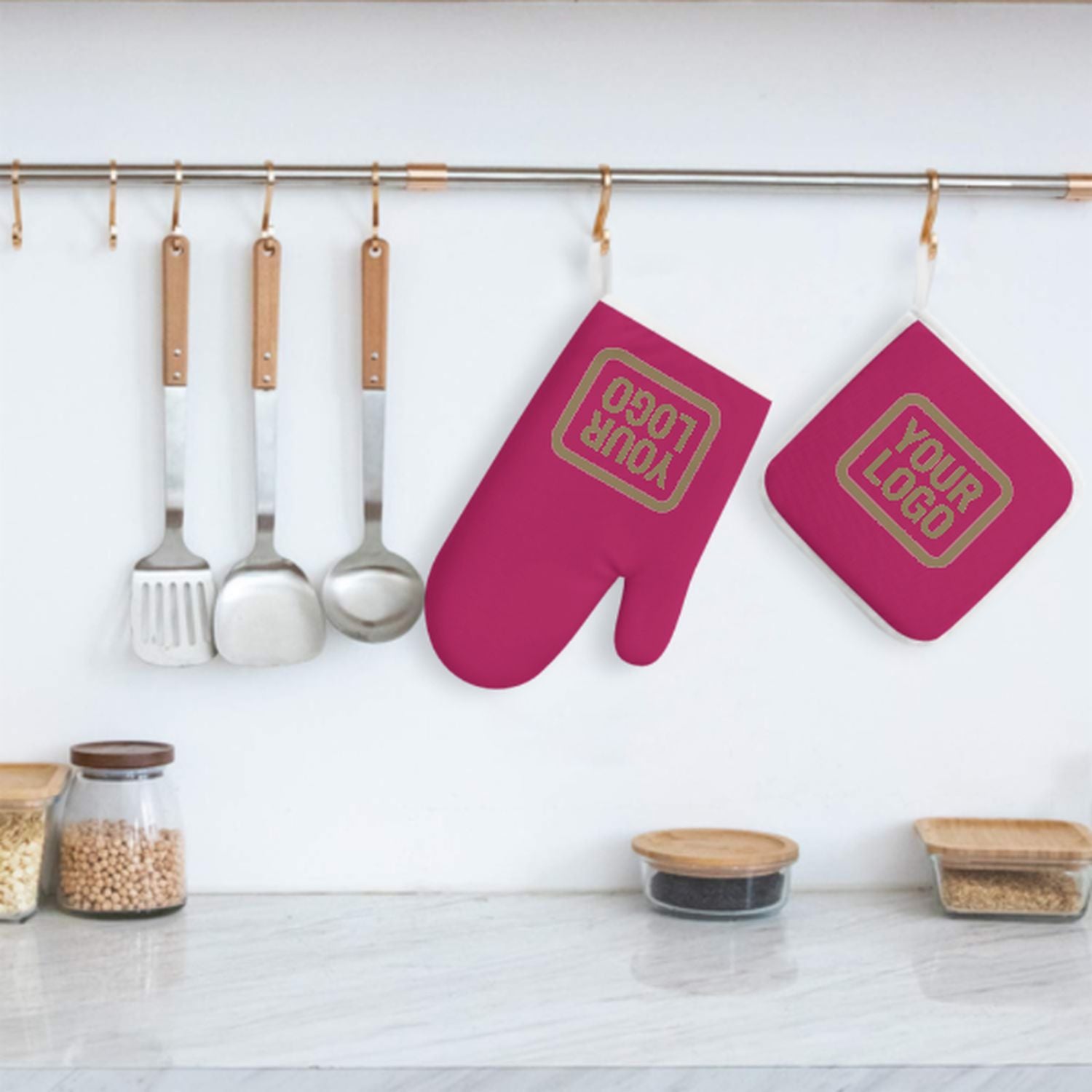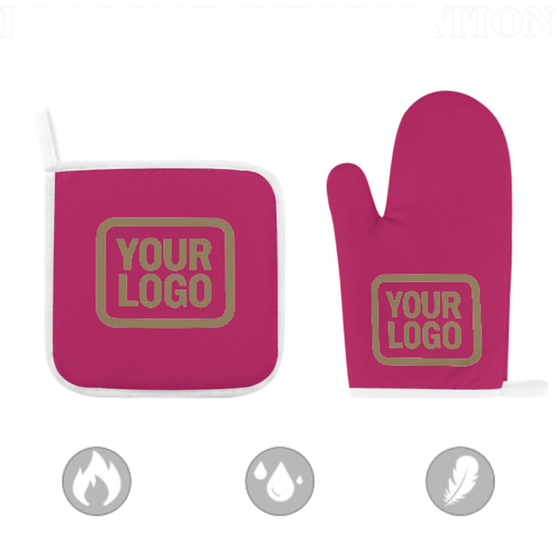 Ett snyggt, värmebeständigt set med ugnsvantar i två delar tillverkat av slitstarkt polyestertyg, perfekt för säkerhet och komfort vid matlagning och bakning.