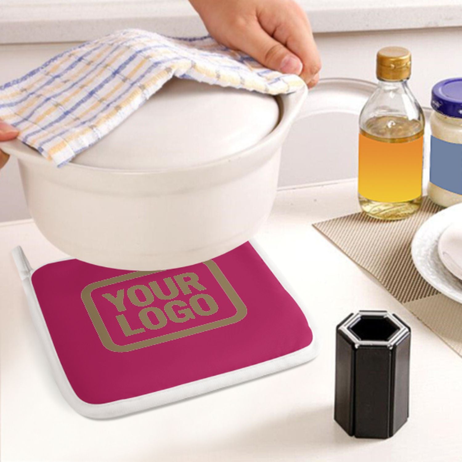 • Hitzeschutz: Verdickte Naturfaser-Isolierung schützt sicher vor heißen Töpfen und Backformen.