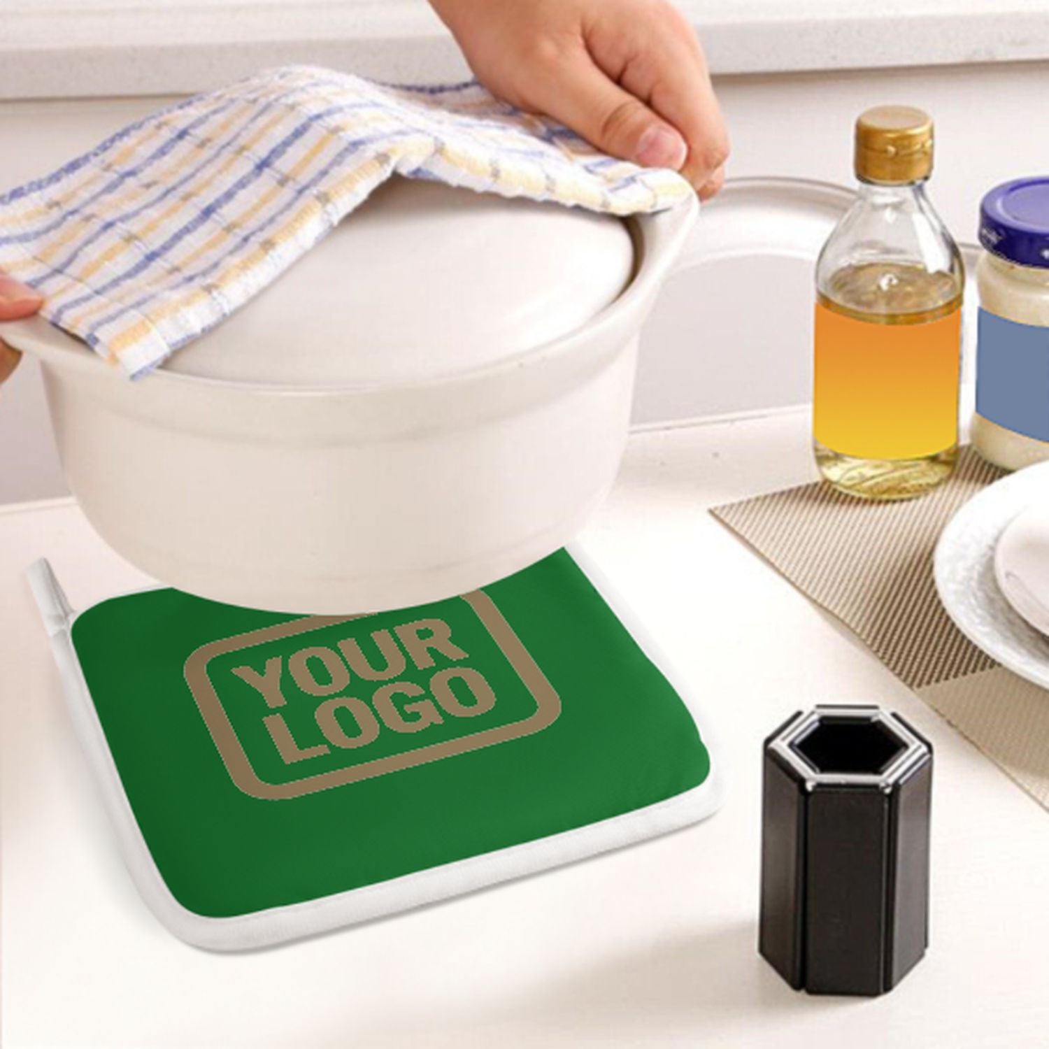 • Hitzeschutz: Verdickte Naturfaser-Isolierung schützt sicher vor heißen Töpfen und Backformen.