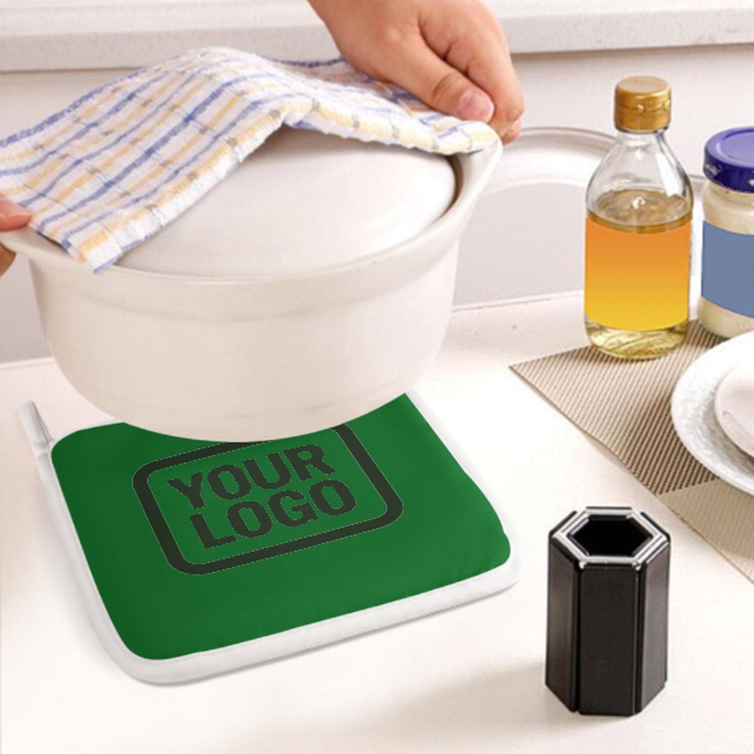 • Hitzeschutz: Verdickte Naturfaser-Isolierung schützt sicher vor heißen Töpfen und Backformen.