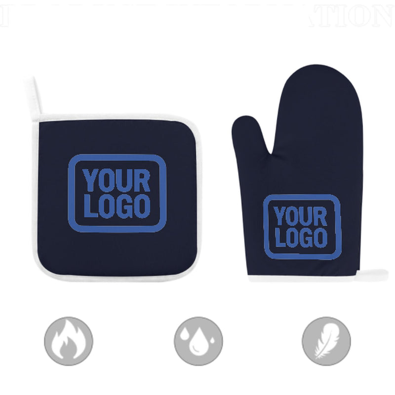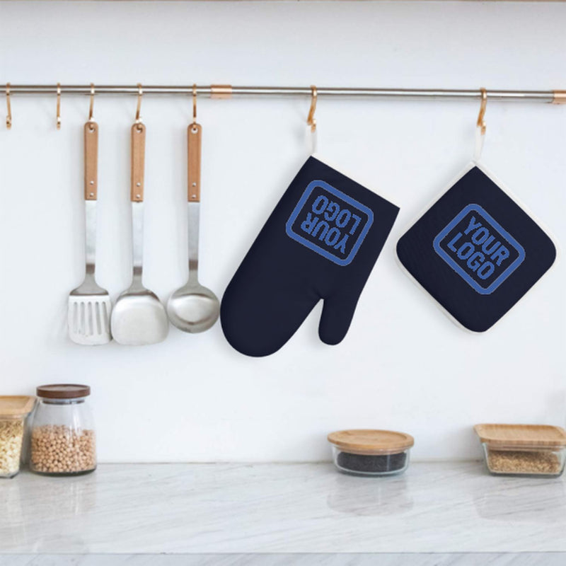 Ett snyggt, värmebeständigt set med ugnsvantar i två delar tillverkat av slitstarkt polyestertyg, perfekt för säkerhet och komfort vid matlagning och bakning.