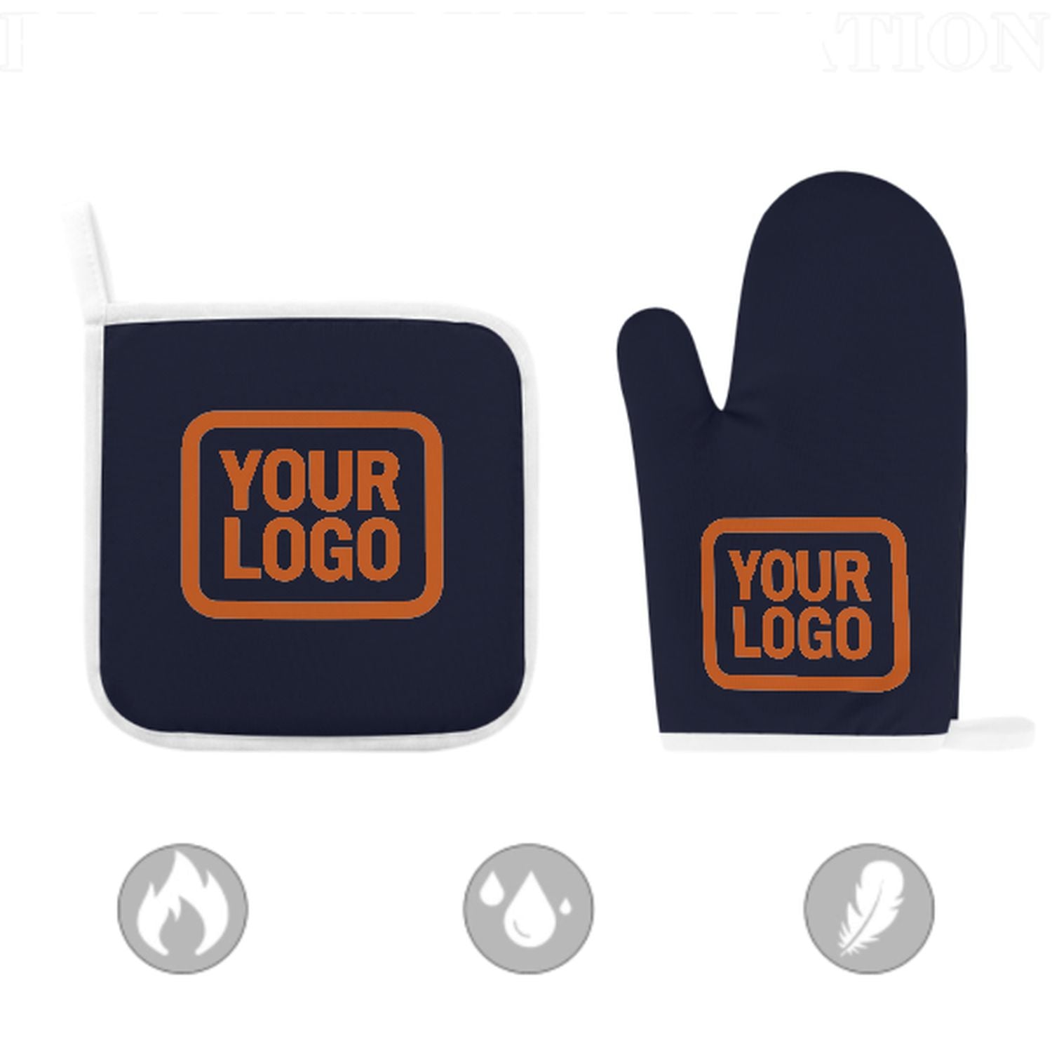 Ett snyggt, värmebeständigt set med ugnsvantar i två delar tillverkat av slitstarkt polyestertyg, perfekt för säkerhet och komfort vid matlagning och bakning.